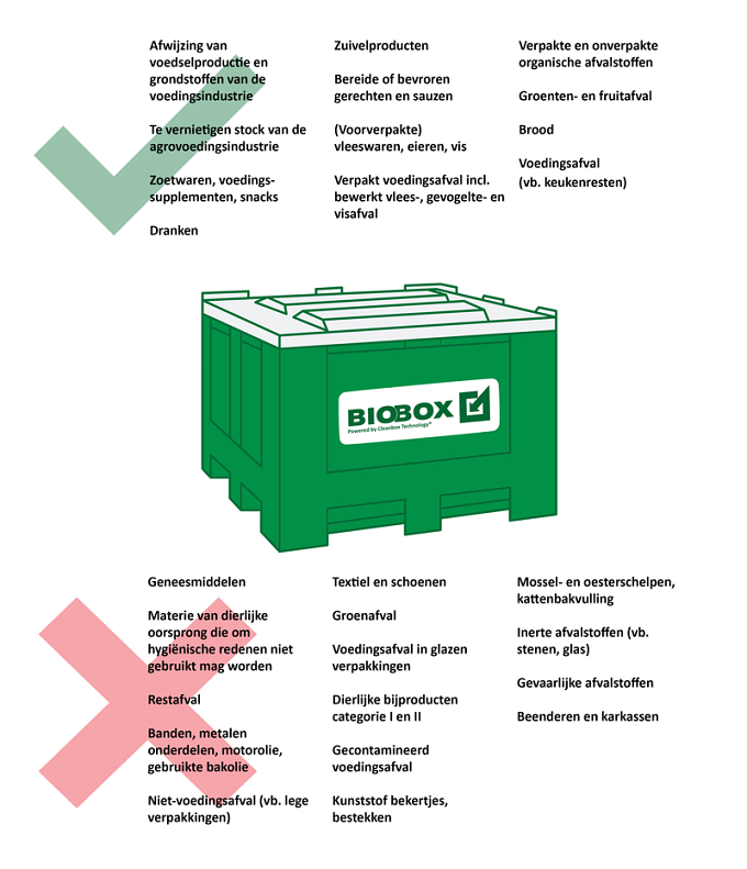 Afhankelijk van de container, worden bepaalde soorten afval al dan niet toegelaten. Zo mag in onze 140 L rolcontainer enkel onverpakt voedingsafval, terwijl verpakt voedingsafval wel toegelaten is in onze Biobox (lage palletbox 680 L).