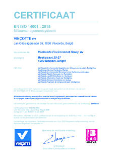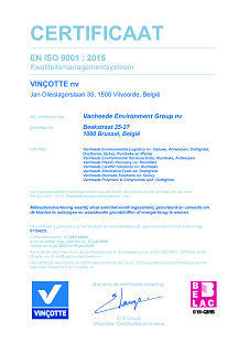 Vanheede Environment Group is ook in het bezit van het ISO 9001-certificaat. Dit is een wereldwijd erkende norm met eisen op het gebied van kwaliteitsmanagement en daardoor een maatstaf voor transparantie en betrouwbaarheid in de markt.
